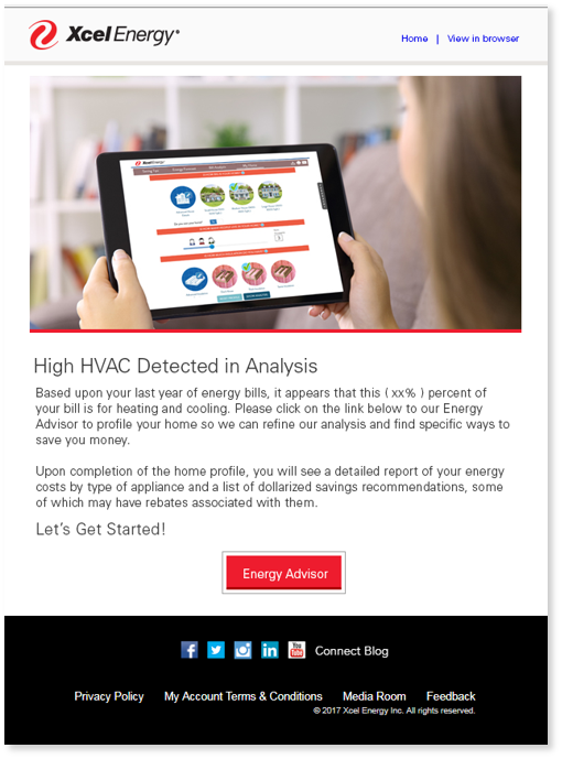 The pilot revealed that 89% of Xcel customers thought the videos were very or somewhat useful with 92% giving encouraging feedback. The video bill explanation went only to customers whose bills had increased by more than $20, and each quantified and explained the factors causing the bill to be higher (weather, days of service, rate change, behavior). Of the recipients reporting, 58% reported improved perception of the utilities brand. The personalized email inviting customers to fill out a home profile to receive a free online energy audit allowed Xcel to collect more home profiles and this data is now available for Xcel to use to further customize messages for future campaigns.